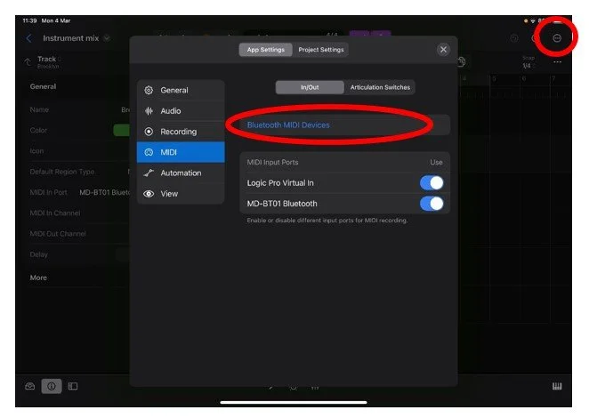 Go to settings which are accessed from the top right-hand corner. A menu will be displayed to show all the MIDI Bluetooth sources detected.